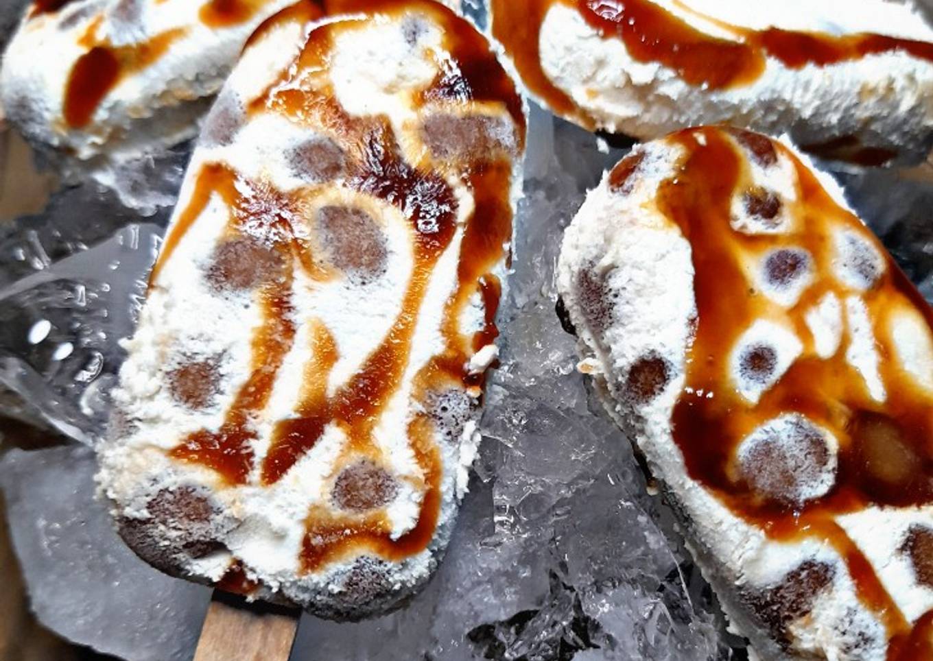 - Assembling: isi piping bag dengan ice cream base dan boba pearls secara bergantian (2:1). Siapkan cetakan es loli atau cup, olesi dengan brown sugar syrup, tuang ice cream boba, beri brown sugar syrup sebagai topping (optional), lakukan hingga habis.