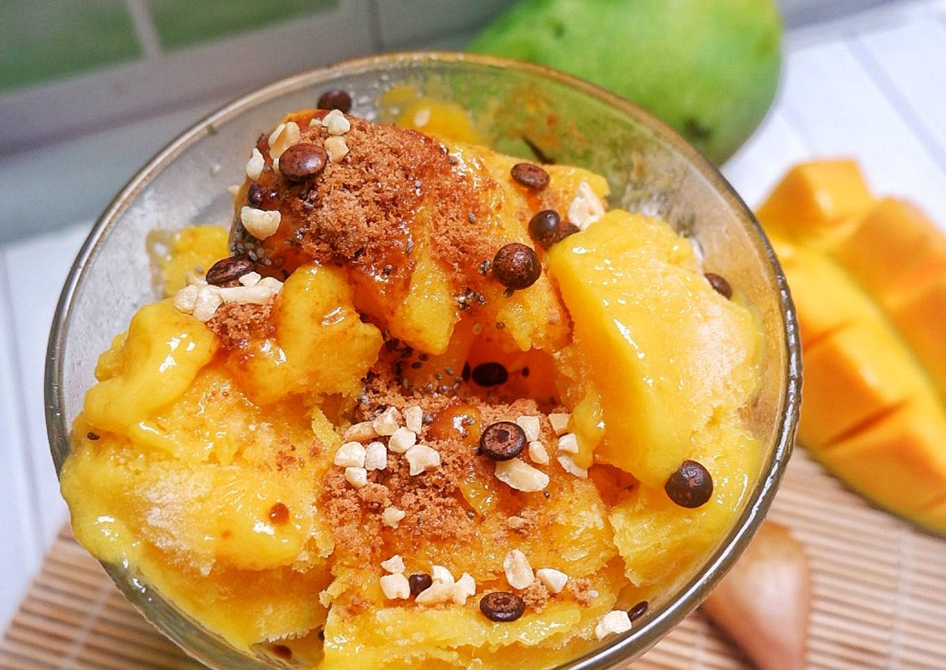 - Simpan di frezeer, setelah jadi es, kerok es mangga masukan dalam gelas hidang, taburi topping diatasnya. Sajikan.
