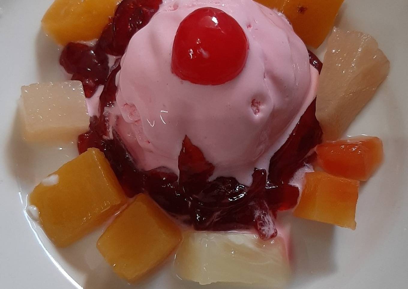 - Taruh ice cream dipiring, tambahkan selai strawberry dan buah kaleng. Sajikan deh.