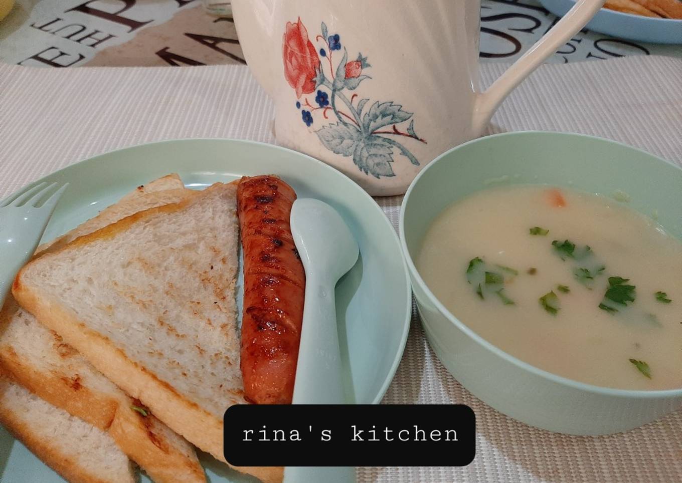 - Tata roti dan sosis dalam piring. Sajikan sup krim panas-panas dalam mangkok terpisah. Taburi dengan daun seledri atau parsley. Lengkapi dengan saos sambal jika suka. Siapkan jg teh panas untuk menemani sarapan. Makan rotinya bisa sambil dicelup, anak saya sukanya begitu, gurih dan lembut katanya😊 tapi memang menurut saya sup krim merek ini enak.