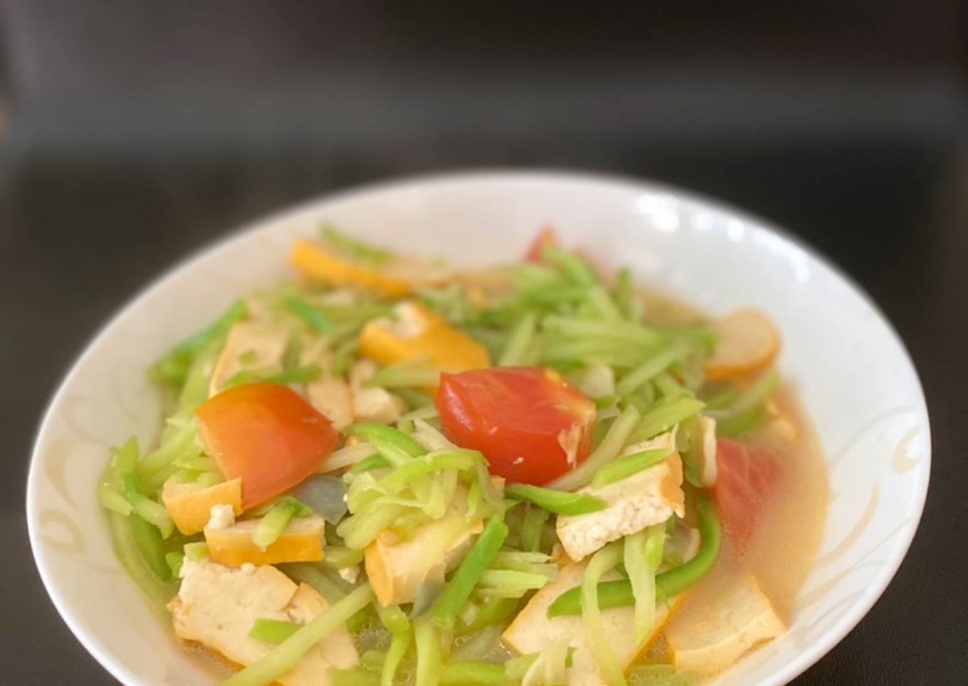 - Masukkan labu hingga setengah matang, tambahkan tomat. Masak hingga mendidih dan layu, koreksi rasa.