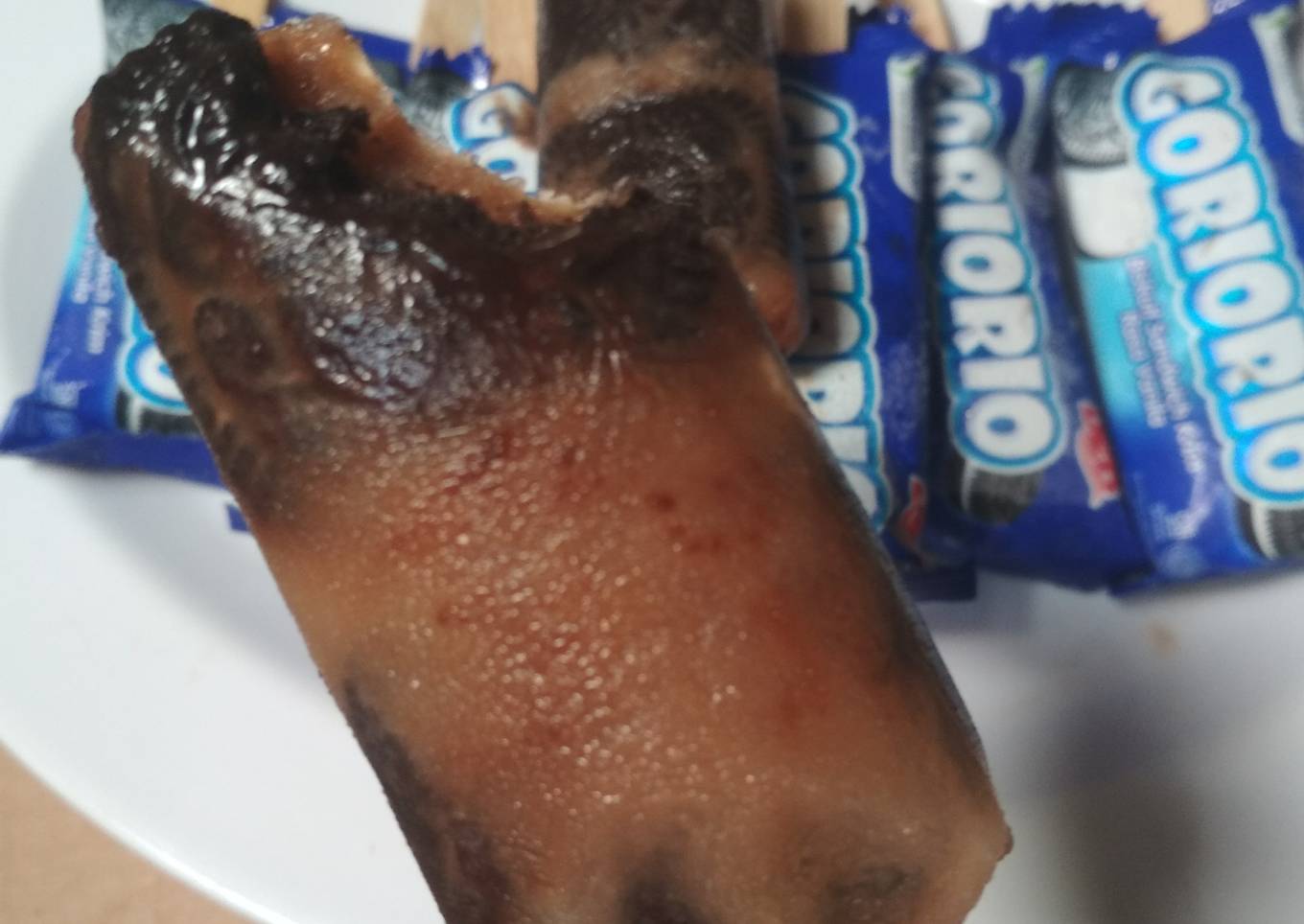 - Seduh skm dan gula dengan air hangat lalu masukan kedalam kemasan gorio, lalu masukan freezer sampai beku
