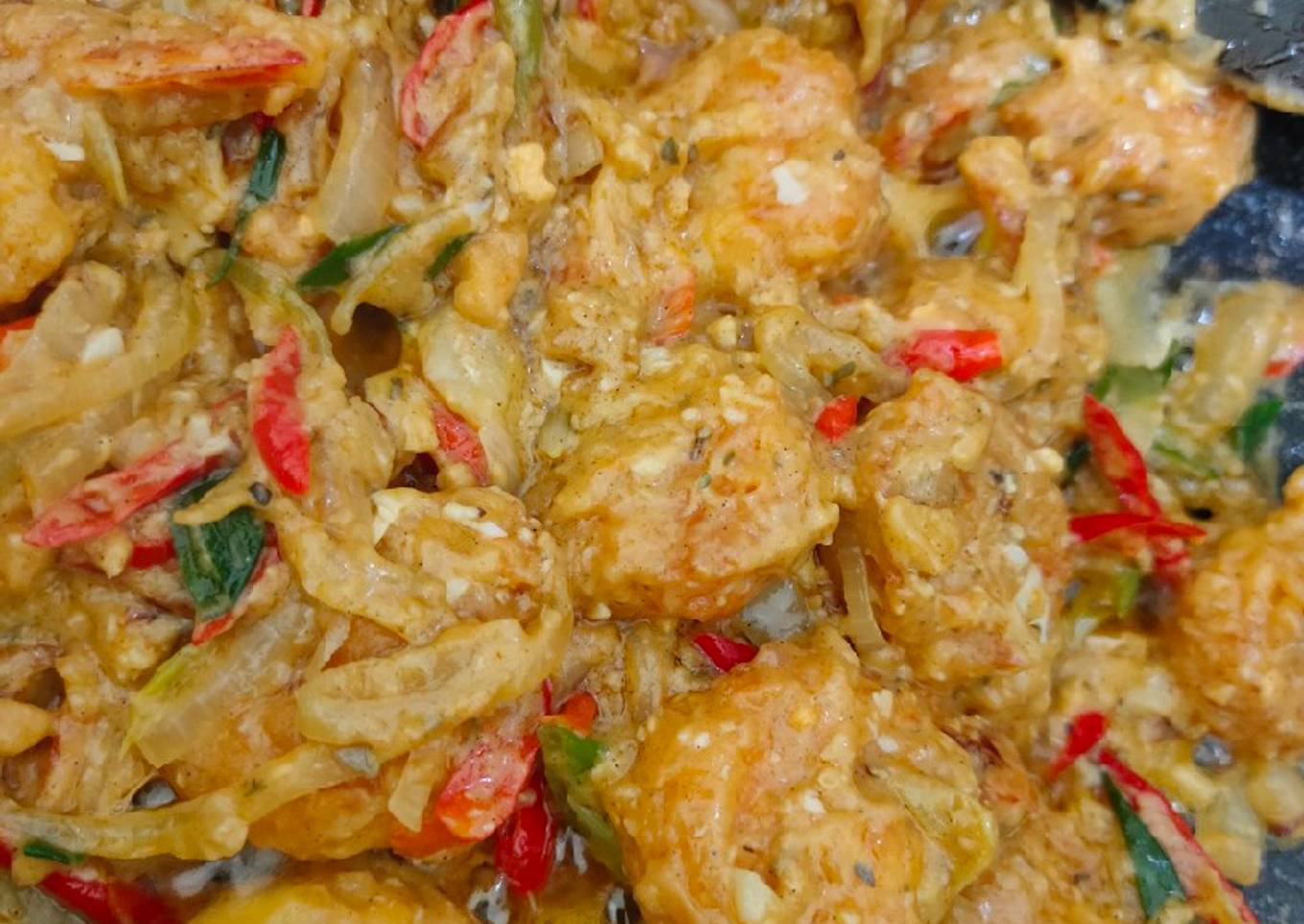 - Tumis bumbu sampai harum masukan semua penyedapnya juga lalu tuangkan saus telur asinnya lanjut udangnya.