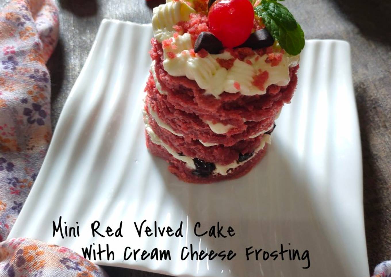 - Lalu taburi cake yg telah dihancurkan. Dan potongan coklat. Lalu beri cheri dan daun mint.Mini Red Velved Cake siap disajikan