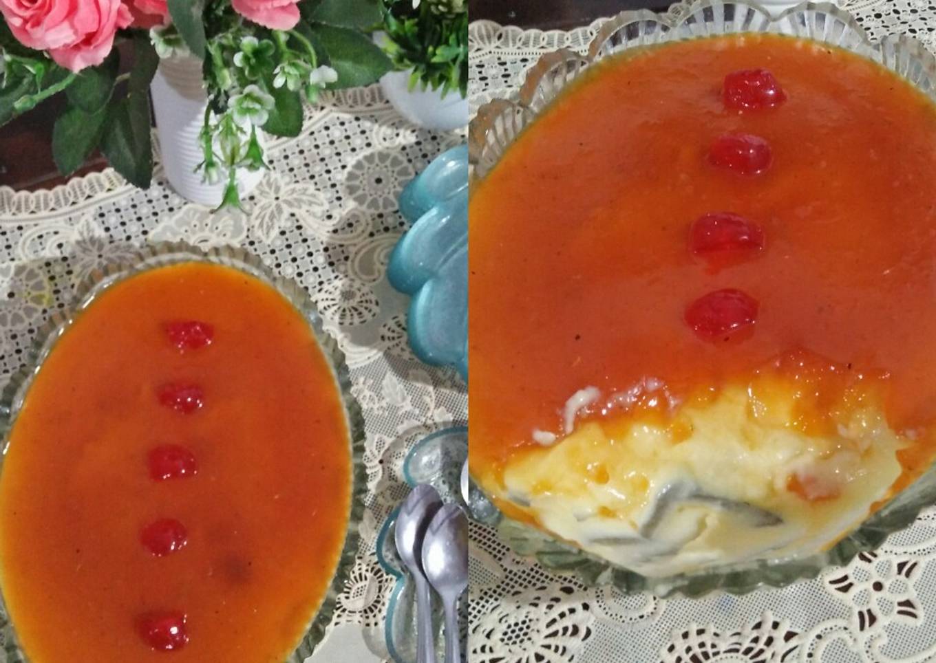 - Siramkan saus karamel ke permukaan adonan susu tadi,dan ratakan,simpan dikulkas 1-2 jam,sajikannn