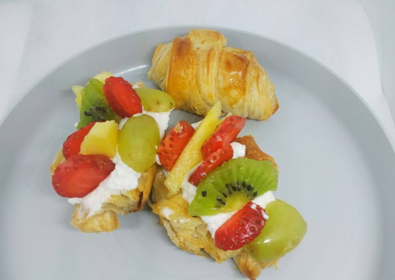 - Croissant matang angkat dan dinginkan, kemudian oleskan cheese cream dan tambahkan berbagai buah kesukaan.