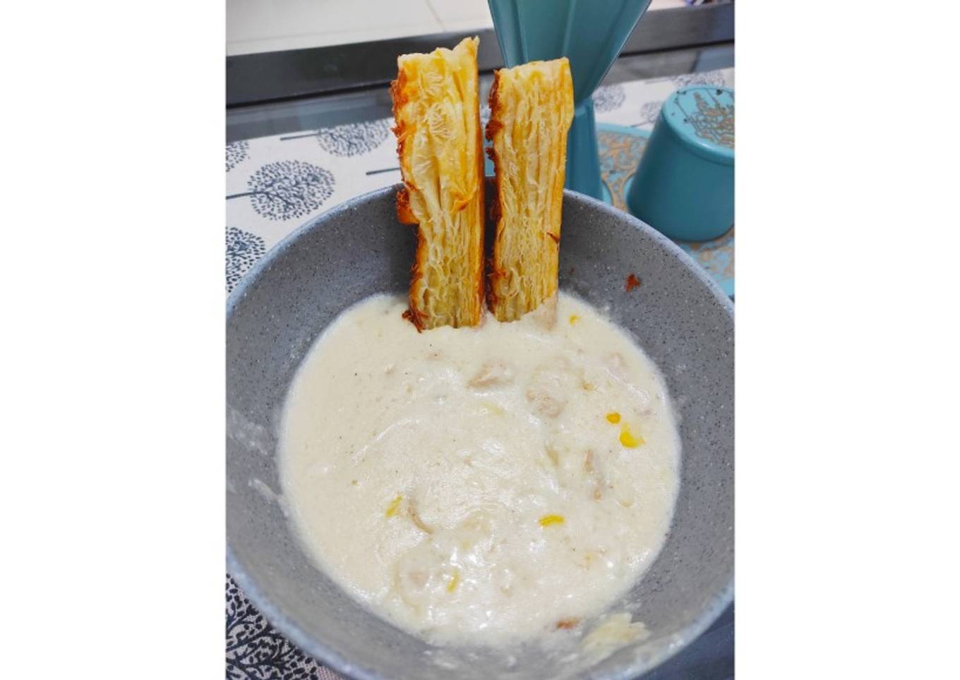 - Setelah cream soup mengental, koreksi rasa kembali jika sudah cukup cream soup siap di santap 👍🥰 dimakan dengan cheese stick sangat cocok!!