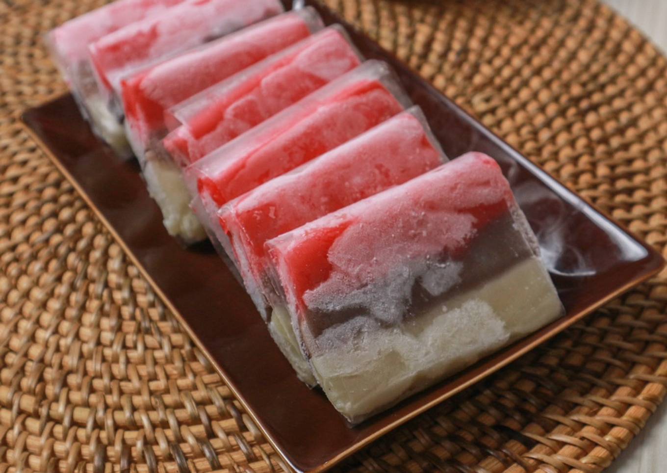 - Jika sudah set, keluarkan dari wadah lalu potong potong dan bungkus dengan plastik agar tidak lengket. Kemudian simpan di frezer sampai mengeras.