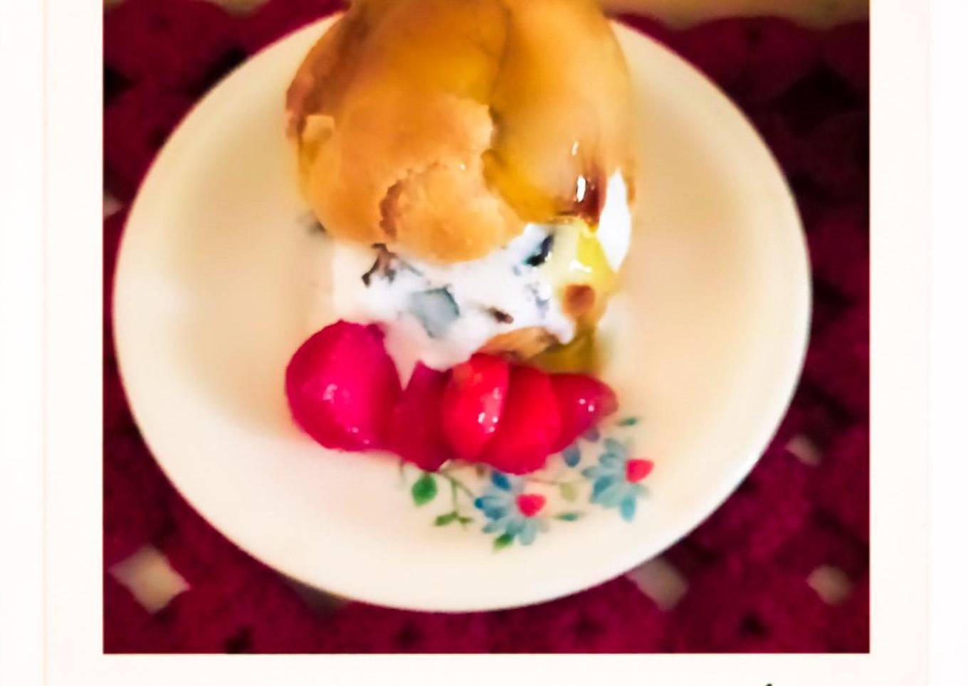 - Belah mandatar sus menjadi dua bagian jangan sampai putus taruh 1 skip kecil es krim ditengahnya. Tutup kembali.