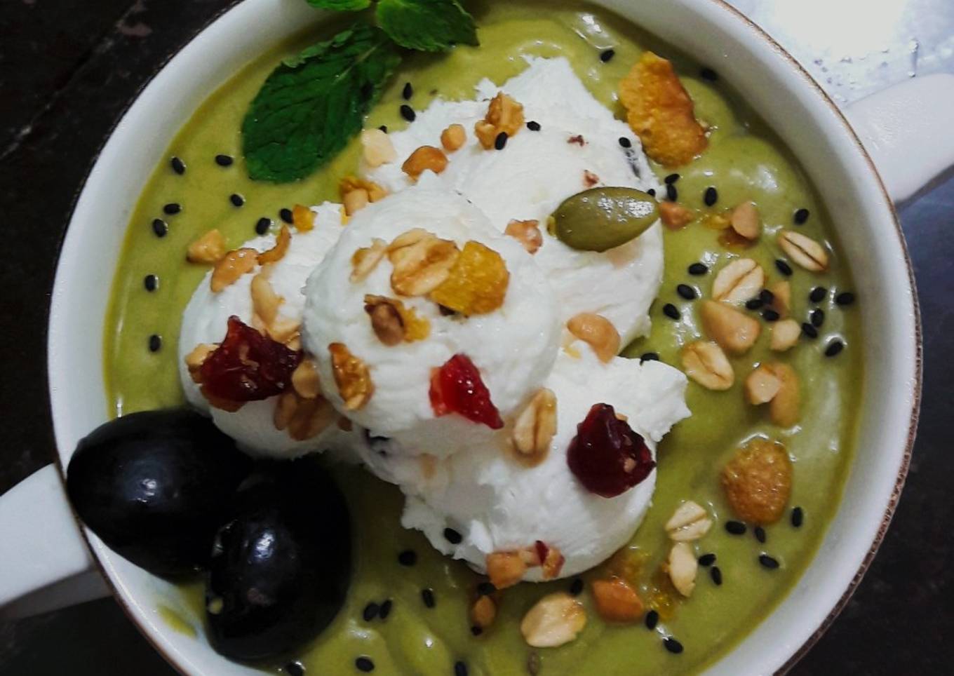 - Pindahkan kedalam wadah, kemudian tambahkan toppingnya. Avocado ice cream siap dinikmati.