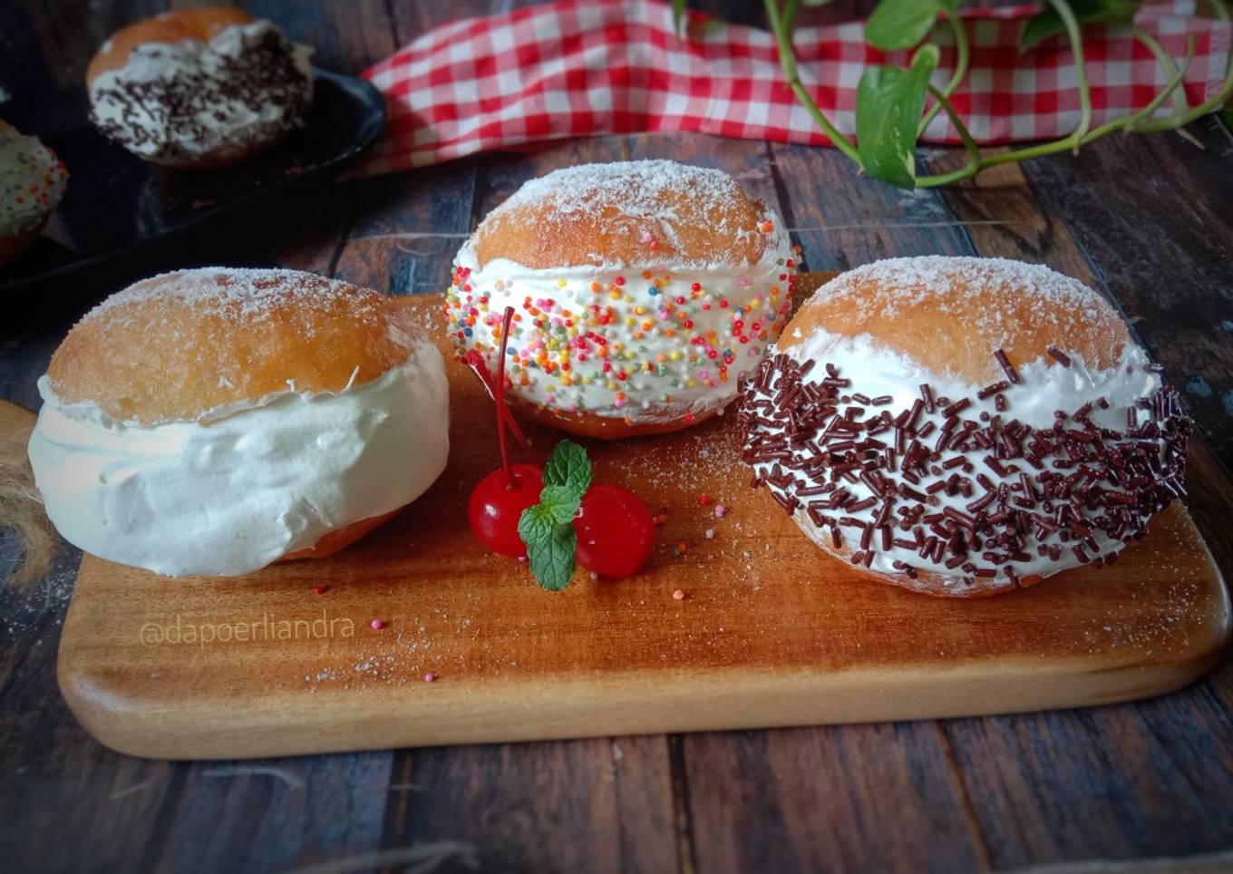 - Penyelesaian. Ambil donat, belah jangan putus. Masukkan whipped cream kedalam piping bag. Oles roti dengan SKM kemudian semprot dengan whipped cream hingga penuh, rapikan dengan spatula. Lakukan hingga habis. Bisa diberi tambahan toping, Simpan dikulkas supaya cream tidak mencair.