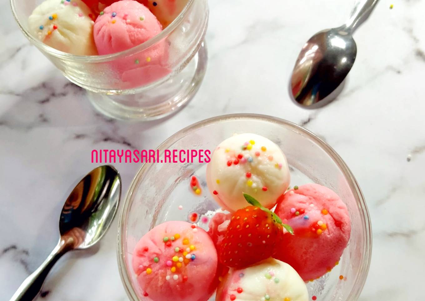 - Tata di atas gelas. Berikan sprinkle gula warna-warni dan. Buah strawberry.
