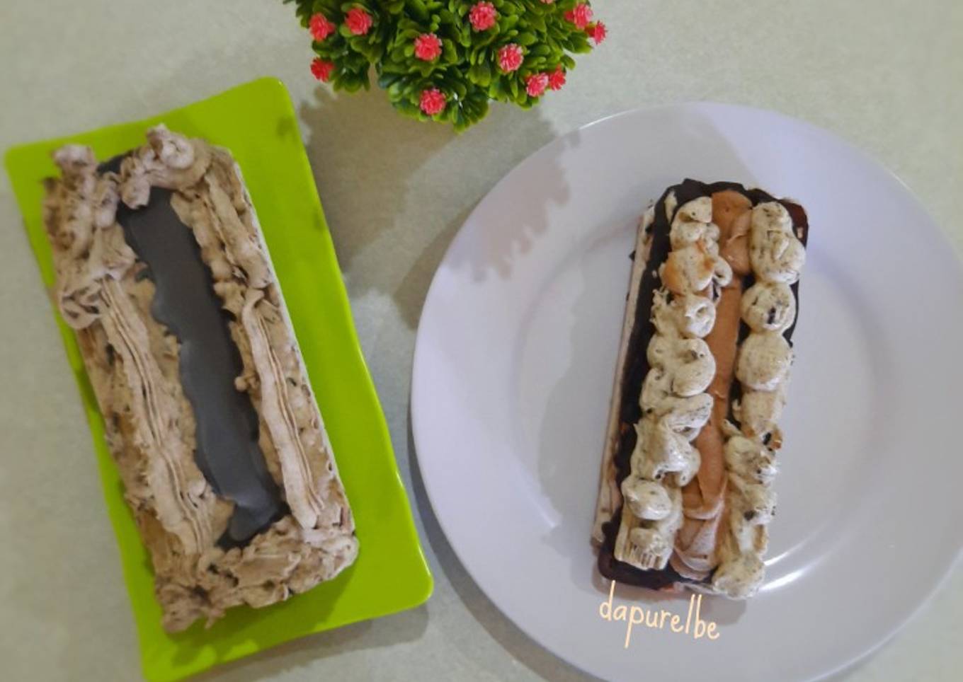 - Mulai proses mencetak dg urutan. Kepingan coklat batang dulu - olesi merata dg ice cream chocolatos - kepingan coklat batang- olesi merata dg ice cream oreo - kepingan coklat batang - hias bagian atas dg ice cream coklat dg bentuk sesuai selera.