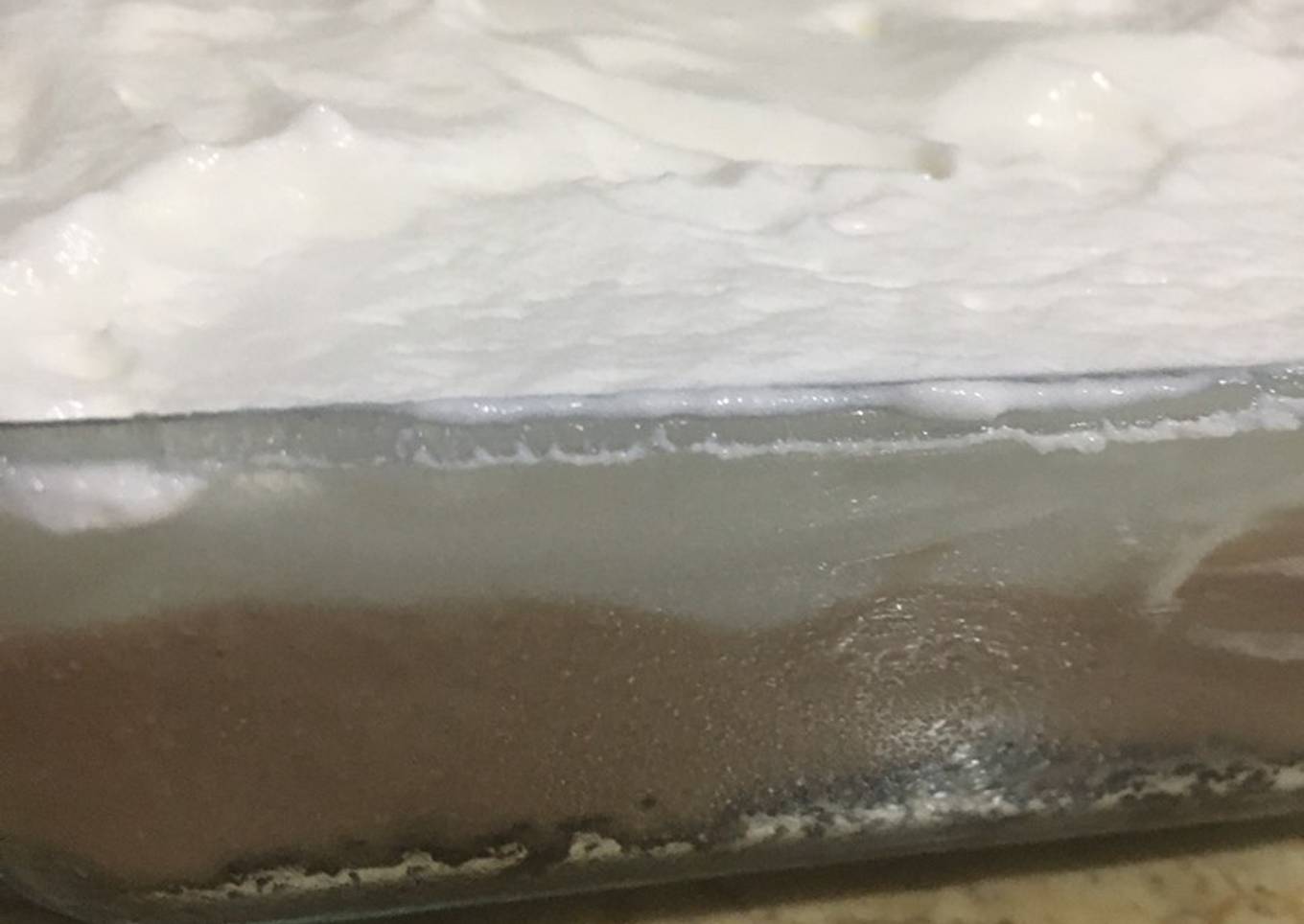 - Lapisan atas: campur Haan dengan air dingin, mixer dengan kecepatan tinggi sampai kaku. Tuang di atas lapisan tengah, ratakan. Masukkan chiller sampai agak kaku dan whipped cream tidak mudah lumer. Siap dimakan