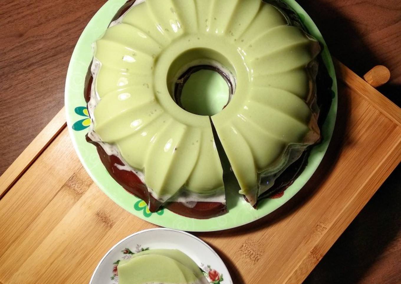 - Campurkan semua bahan lapisan matcha hingga rata dan masak hingga meletup matang. Tuang ke dalam cetakan puding yang sudah dibasahi air terlebih dahulu. Dinginkan hingga bagian atasnya agak mengeras.