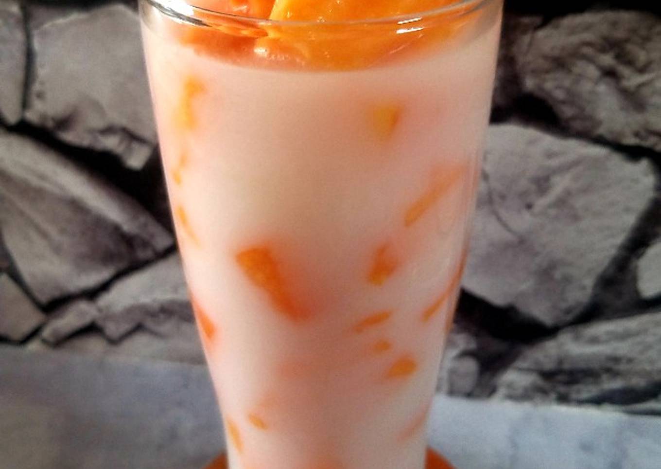 - Dalam gelas saji masukan es batu, pepaya dan tuangkan kuah fiber creme nya. Sajikan