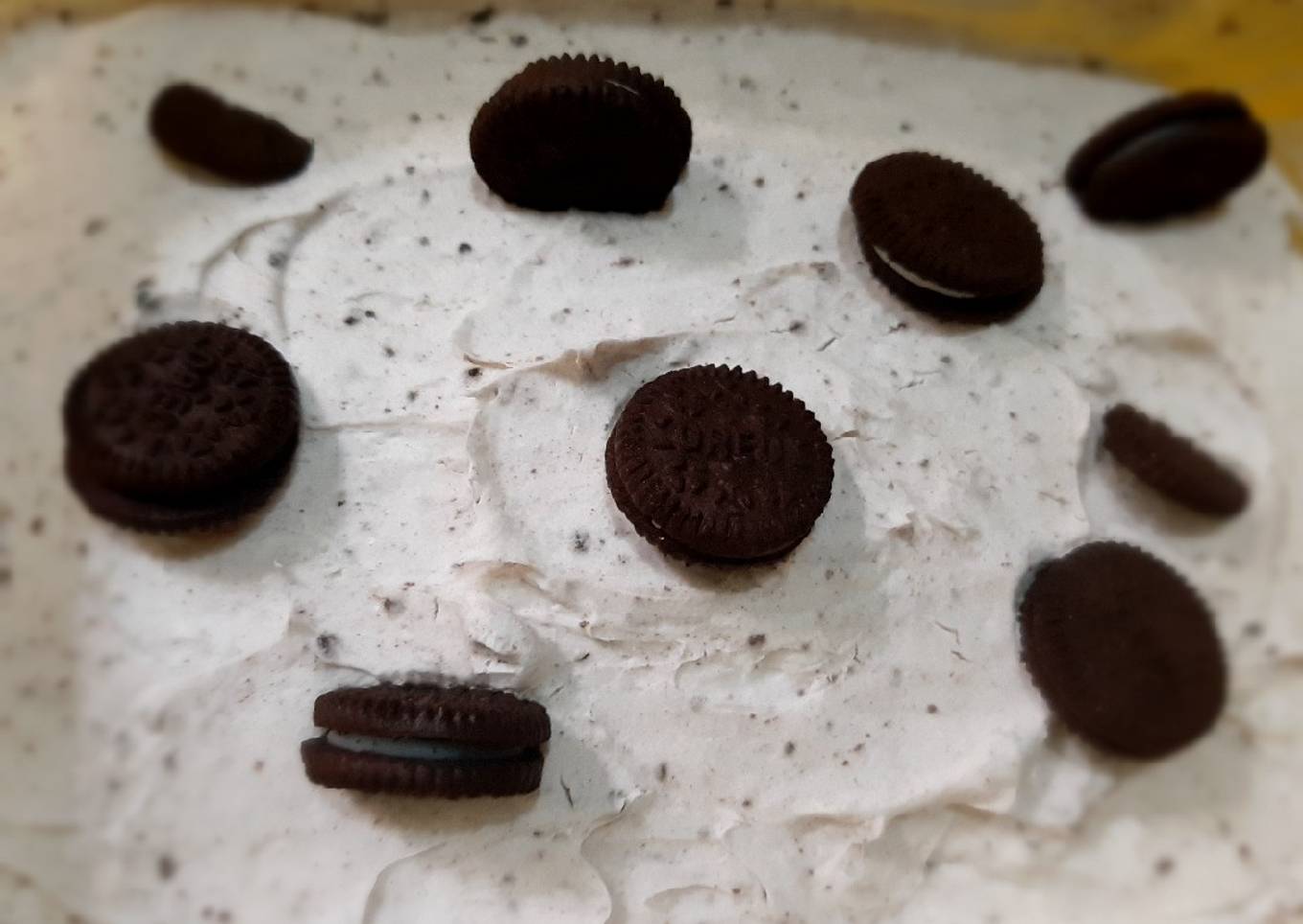 - Tumbuk oreo dan tuang oreo bubuk kedalam whip cream aduk rata, simpan di wadah bekukan min 6 jam