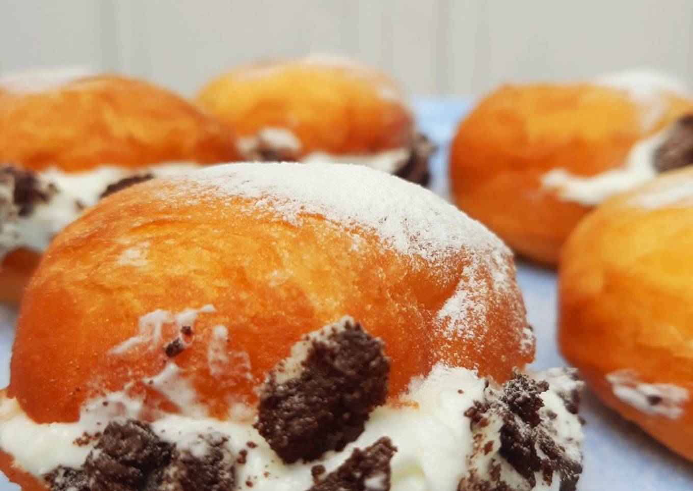 - Belah donat. Olesi dengan susu SKM. Beri cream dan oreo.