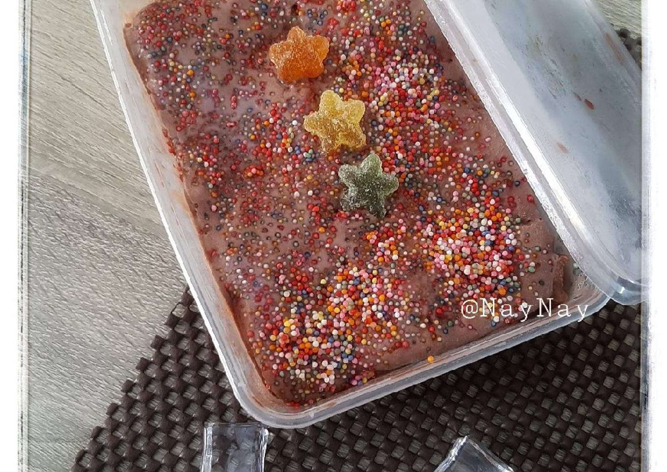 - Potong bolu mengikuti wadah, tuang ice cream dan ratakan,beri spikel warna warni dan yupi bintang.Sajikan deh.Cocok banget untuk hantaran nih.