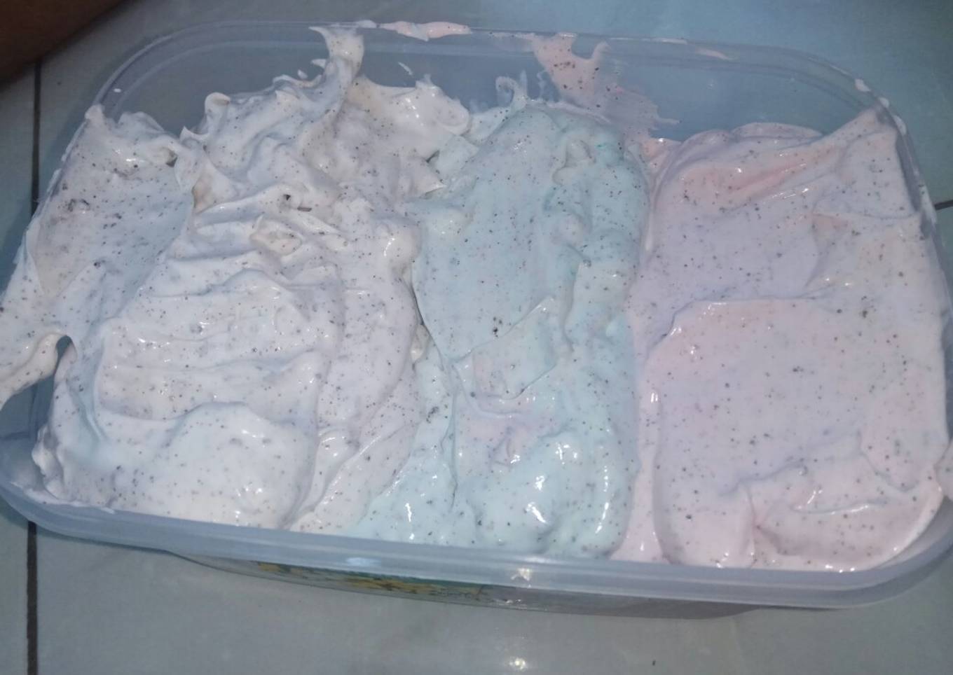 - Bagi adonan mjd 3,rasa stroberi, rasa vanila blue, rasa vanila, ketiganya diberi toping oreo