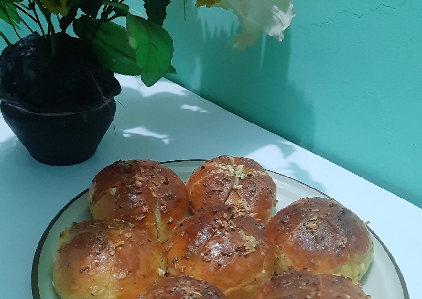 - Setelah adonan mengembang sempurna, olesi adonan dengan bahan olesan dan oven selama 10-12 menit dengan suhu 180°C (api atas dan bawah). Bersamaan dengan oven, buat garlic sauce dengan mencampur semua bahan garlic sauce.