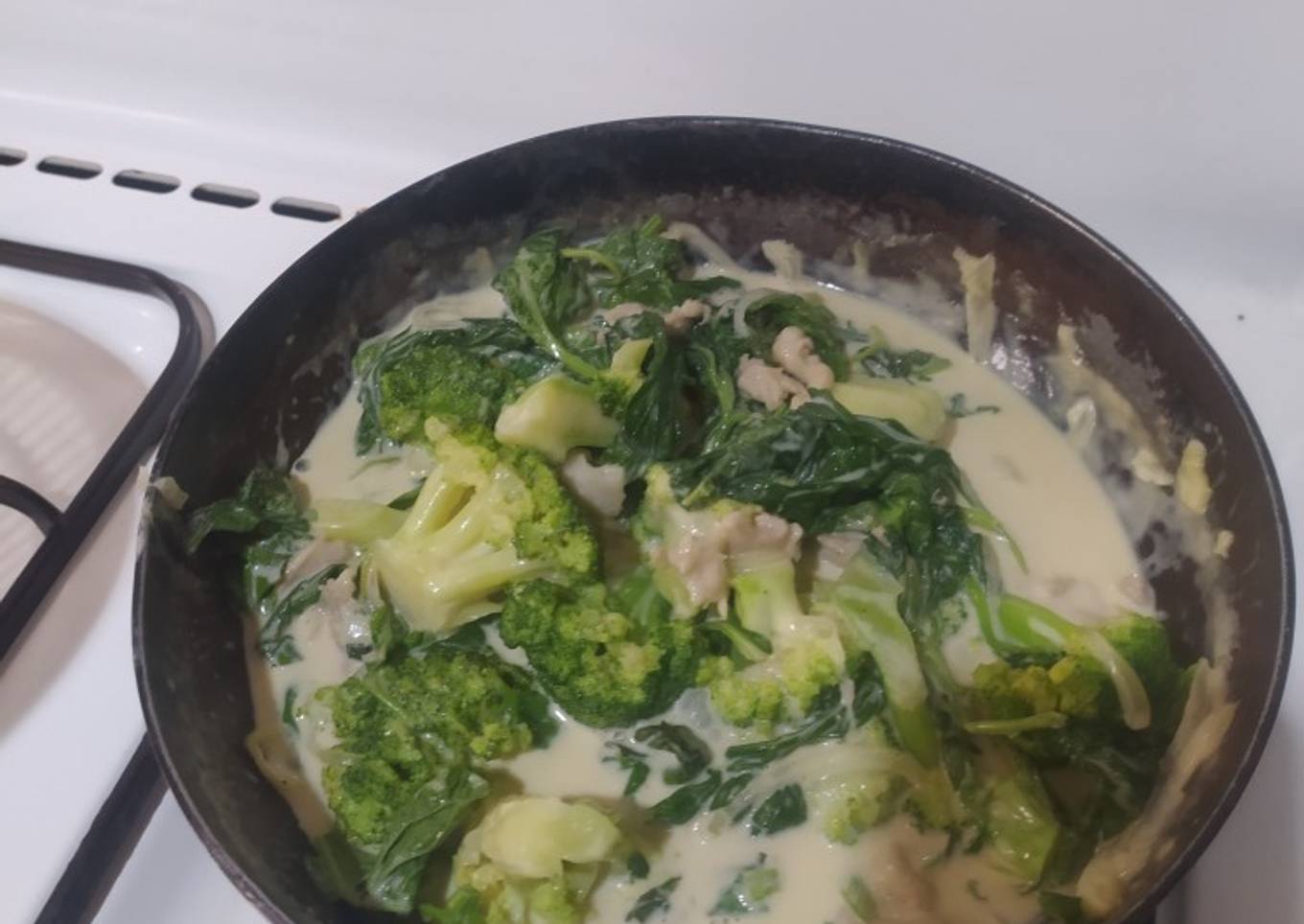 - Masukkan susu, kaldu, keju parut, lada, cooking cream. Lalu masukkan brokoli. Masak hinggal brokoli mulai matang sekita 3menit.