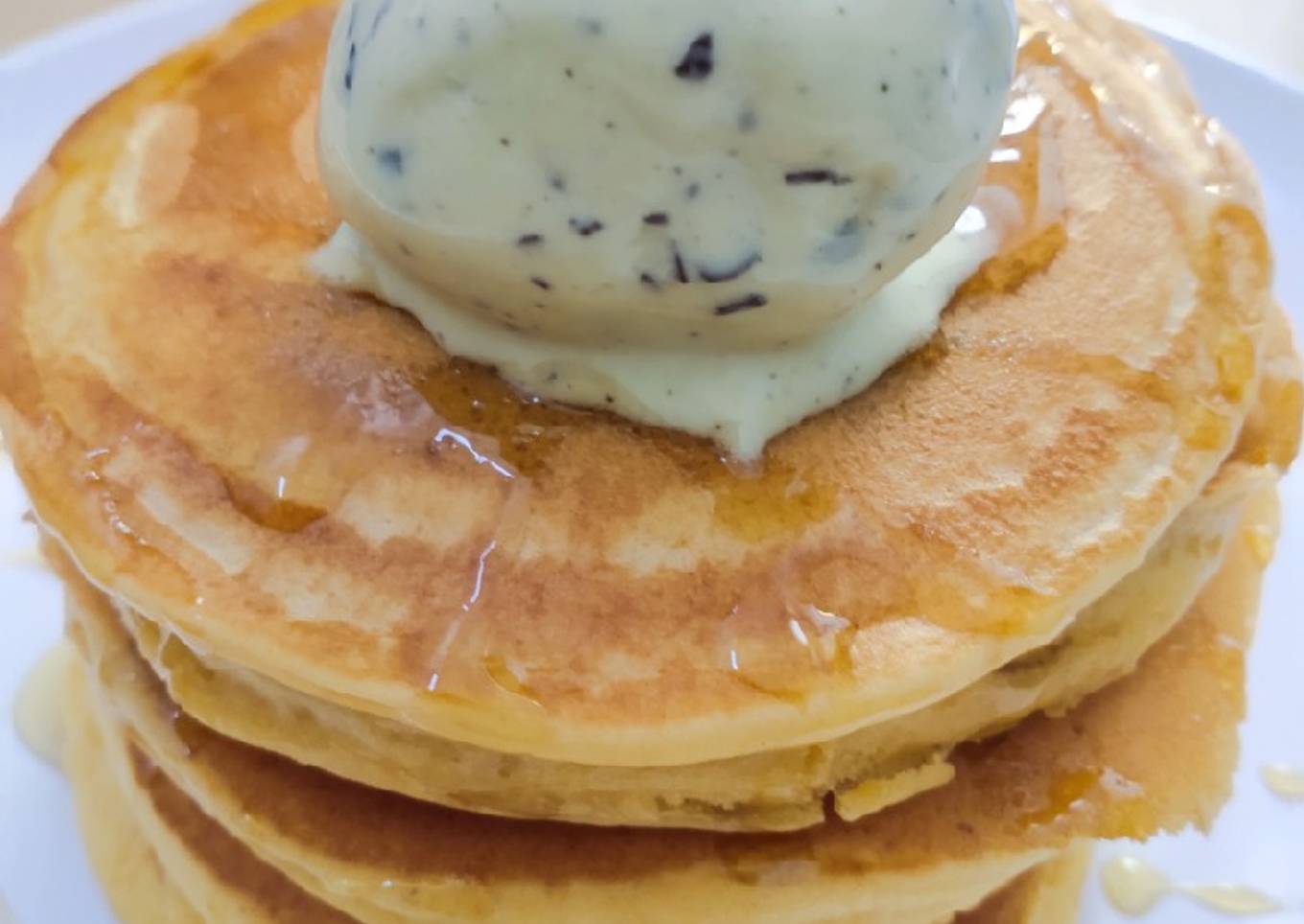 - Tata menumpuk di atas piring 4-5 tumpukan lalu siram dengan madu atau sirup mapple dan tambahkan topping es krim sesuai selera