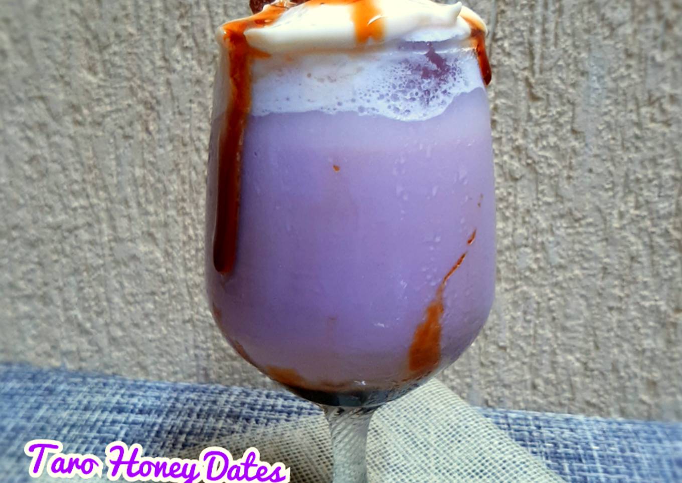 - Blender sampai es hancur lalu masukkan 2 sdm honey dates lalu tuang taro blend nya