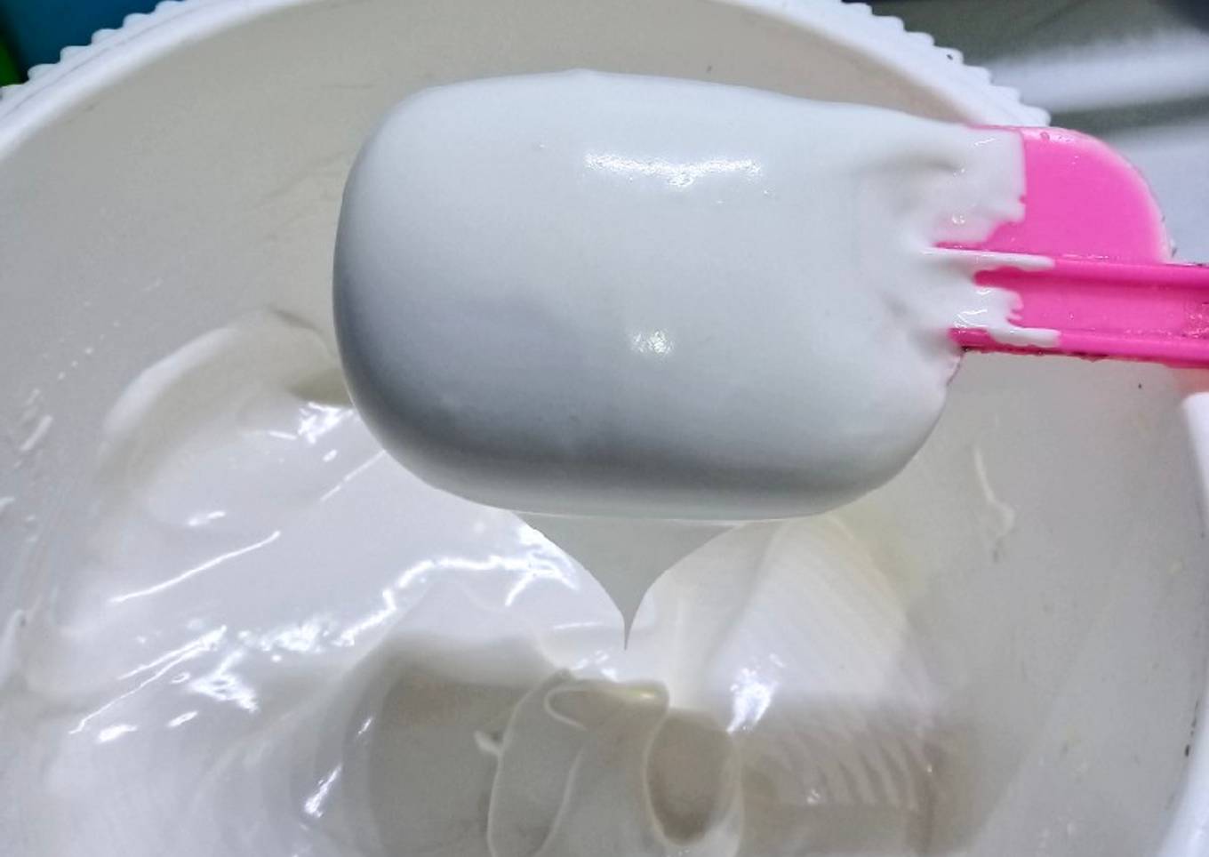 - Campur semua bahan, mixer dengan kecepatan tinggi hingga putih berjejak.