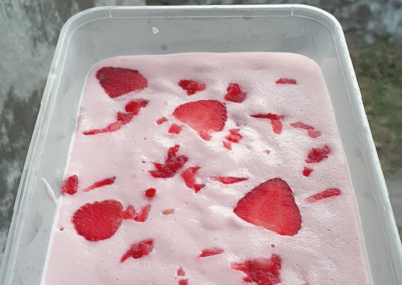 - Pindahkan adonan es krim ke dalam wadah, taburi atasnya dengan sisa potongan stroberi. Bekukan.