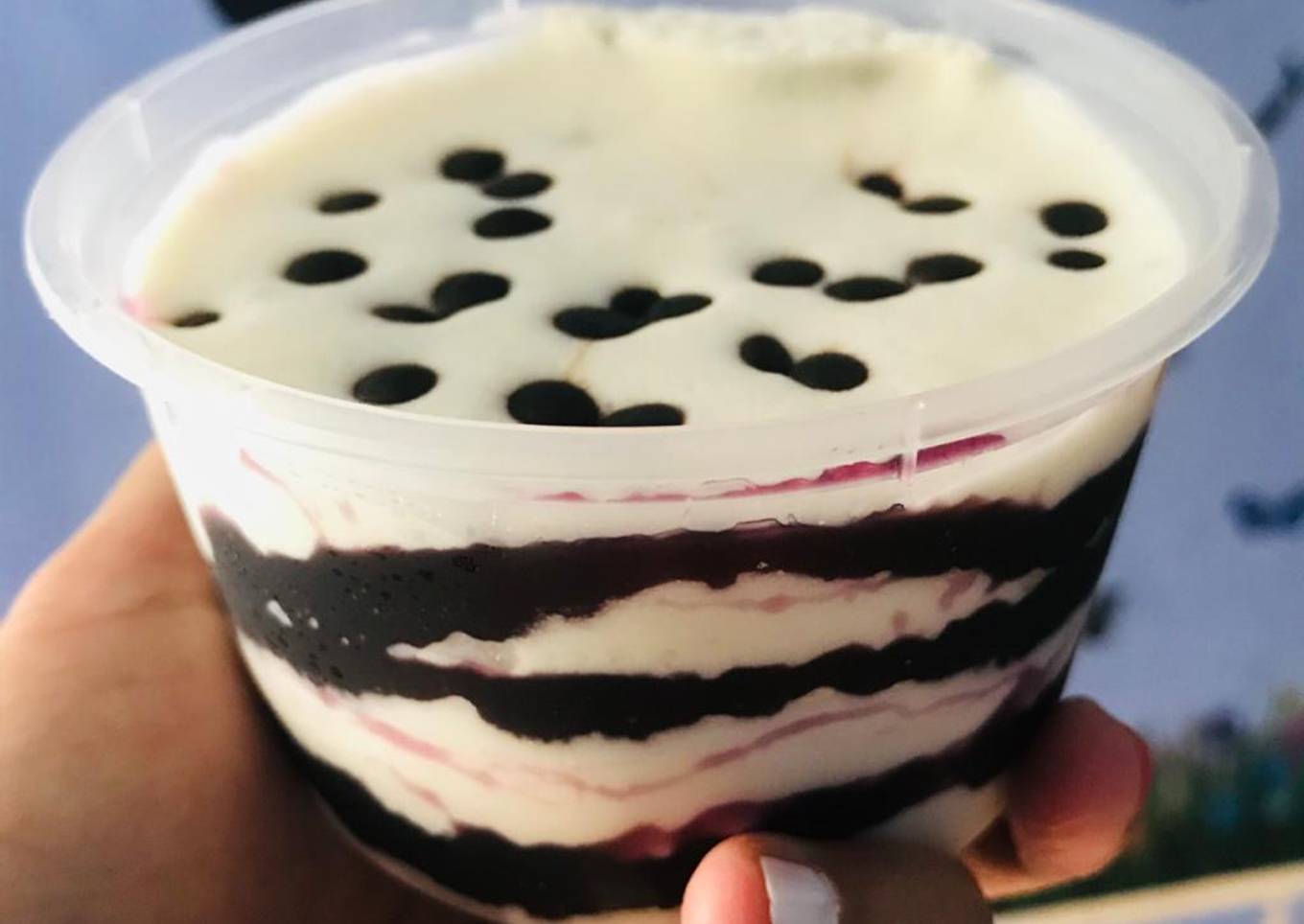 - Masukan di dalam cup dan beri selai blueberry dan topping choco cip (seusai selera aja) dan simpan kembali di freezer hingga beku.