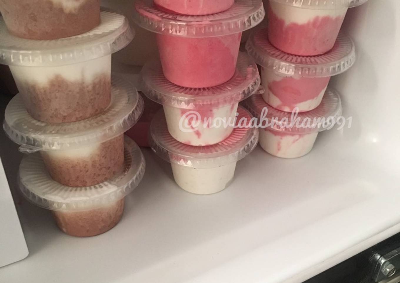 - Setelah adonan jadi bagi adonan menjadi 3 bagian beri pewarna dan perasa makanan. Kalo aku pake perasa makanan red velvet dan black forest. Setelah selesai masukkan ke wadah dan simpan ke dalam kulkas kurang lebih 5 jam. Setelah 5 jam es krim siap di nikmati. Rasa es krim nya lembut, enak dan mirip sama es krim w*ll’s.