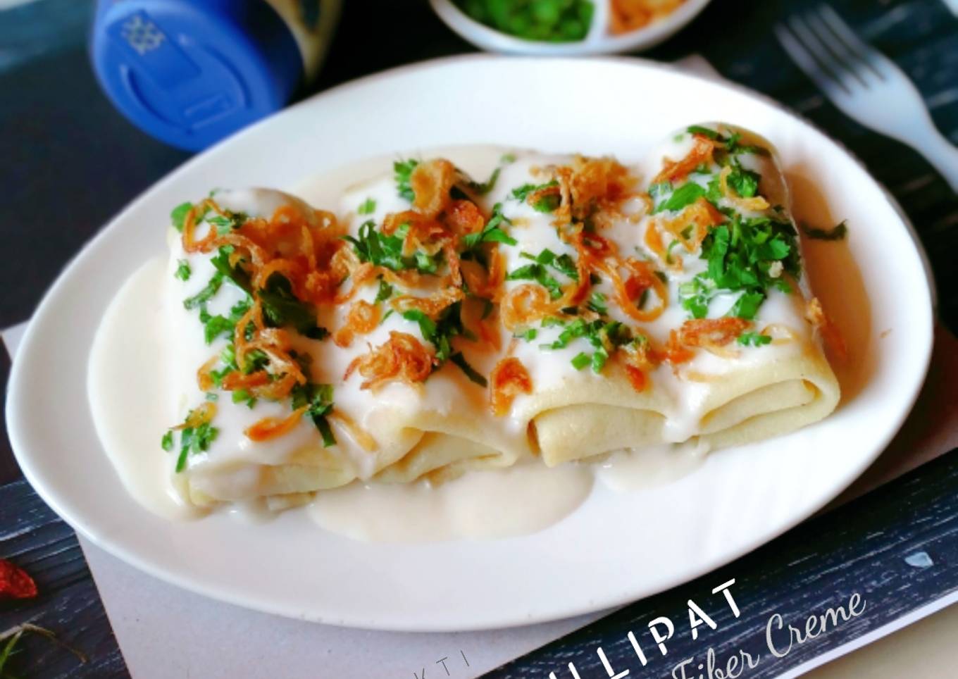 Tata Ipau diatas piring, siram dengan saus fiber creme, lalu taburi dengan daun seledri dan bawang goreng.