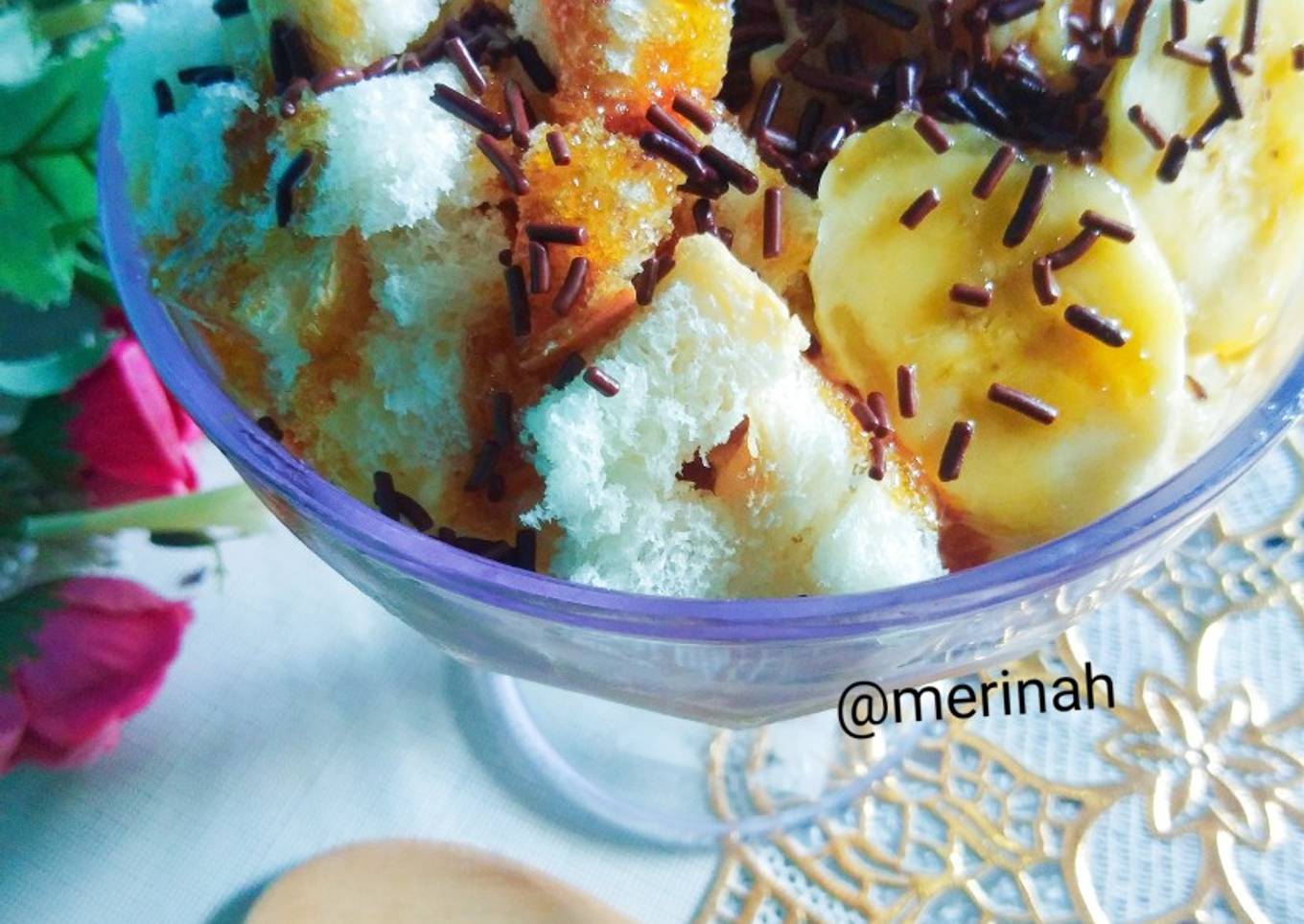 - Sudah keras. keluarkan. keruk pakai sendok. tata ditempat. kasih topping roti tawar. mocha.. secukupnya potongan pisang dan meses. atau sesuai selera.