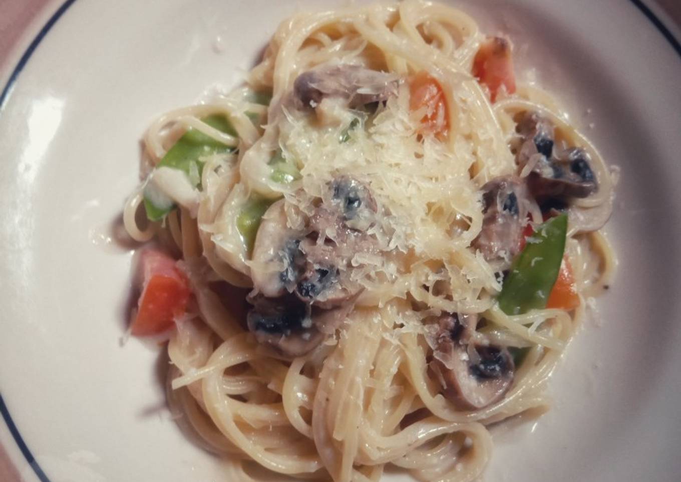 - Siapkan wajan teflon, masukkan margarin. Tumis bawang putih cincang sampe harum. Lalu masukkan jamur, tumis setengah layu. Masukkan kacang kapri. Masukkan air sedikit2 saja (api dikecilkan), masukkan fiber creme, aduk hingga larut. Masukkan keju parut. Air secukupnya saja, volume nyemek2 aja ntr(creamy). Keju parut juga menyesuaikan saja, kalo dirasa udh bisa bikin kental saus, udh oke. Masukkan garam, gula, n lada. Terakhir masukkan spaghetti n tomat. Aduk rata. Selesai.