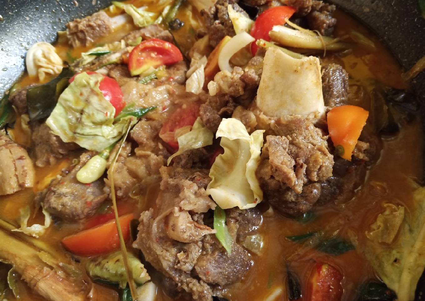 - Masukkan bumbu kedalam rebusan daging kambing, tambahkan fiber cream. Koreksi rasa untuk gula dan garam. Masukkan kayu manis dan kapulaga.