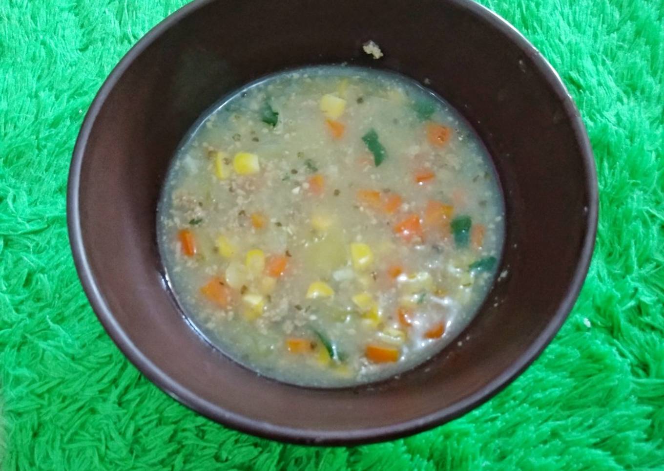 - Tambahkan air, masukkan wortel, kentang dan jagung. Masak hingga sayur matang.