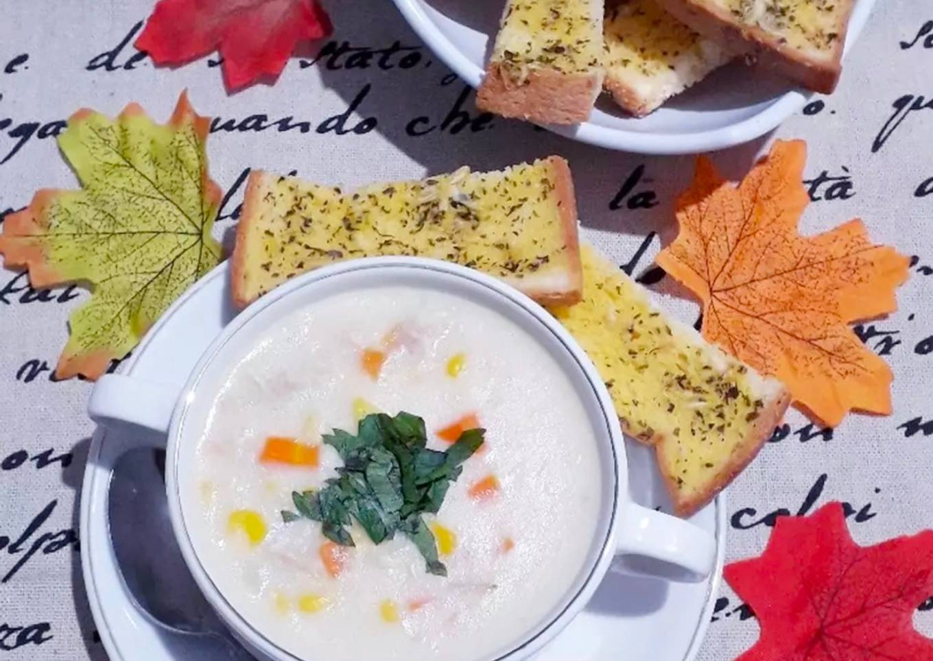 Setelah membuat garlic bread harus ada sup krim ayam dengan isian tambahan jagung dan wortel. Rasanya lembut dan halus juga gurih.