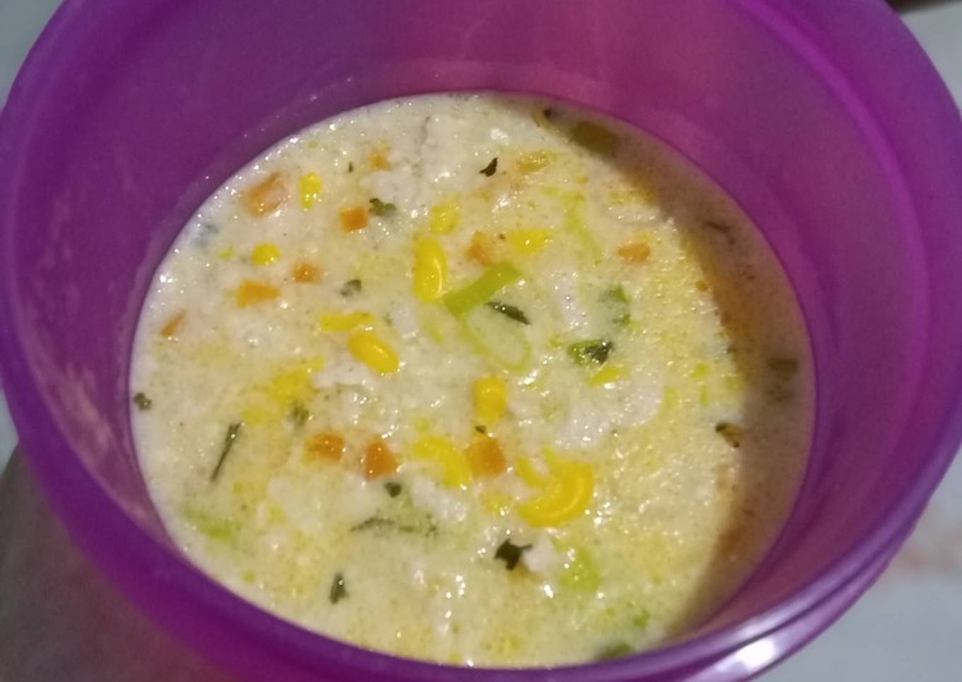 - Masak hingga ayam, wortel dan jagung empuk, lalu masukkan keju, daun bawang dan parsley
