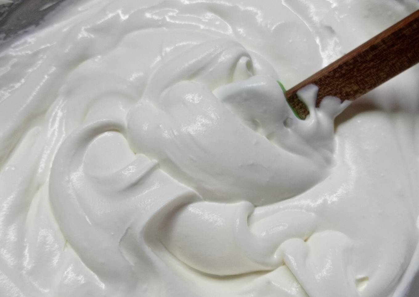 - Dalam satu wadah, kocok whipping cream menggunakan mikser hingga double volume dan kaku, namun jangan overmix.