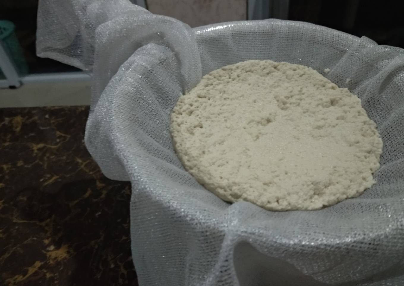 - Sarung dengan kain putih dan saringan, akan terpisah kayak gini. Air whey-nya jangan dibuang, bisa buat tambahan Sup atau jus