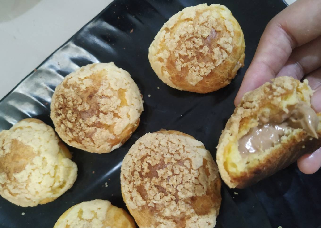- Panaskan oven. Panggang 30 menit dengan suhu 180 dercel. Keluarkan dari oven, biarkan dingin. Setelah dingin, lubangi sedikit di bagian pinggir, isi dengan isian. Siap dimakan. Nyam! Rasanya mirip beli di beard papa 😍
