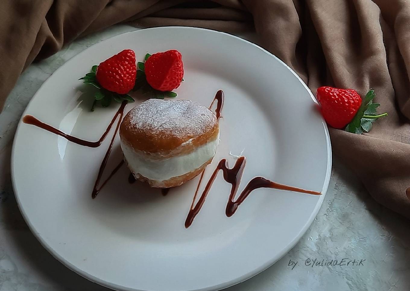 - Belah donat, jangan sampai putus, olesi dalamnya dngn SKM lalu masukkan cream ke dalamnya. Rapikan.
