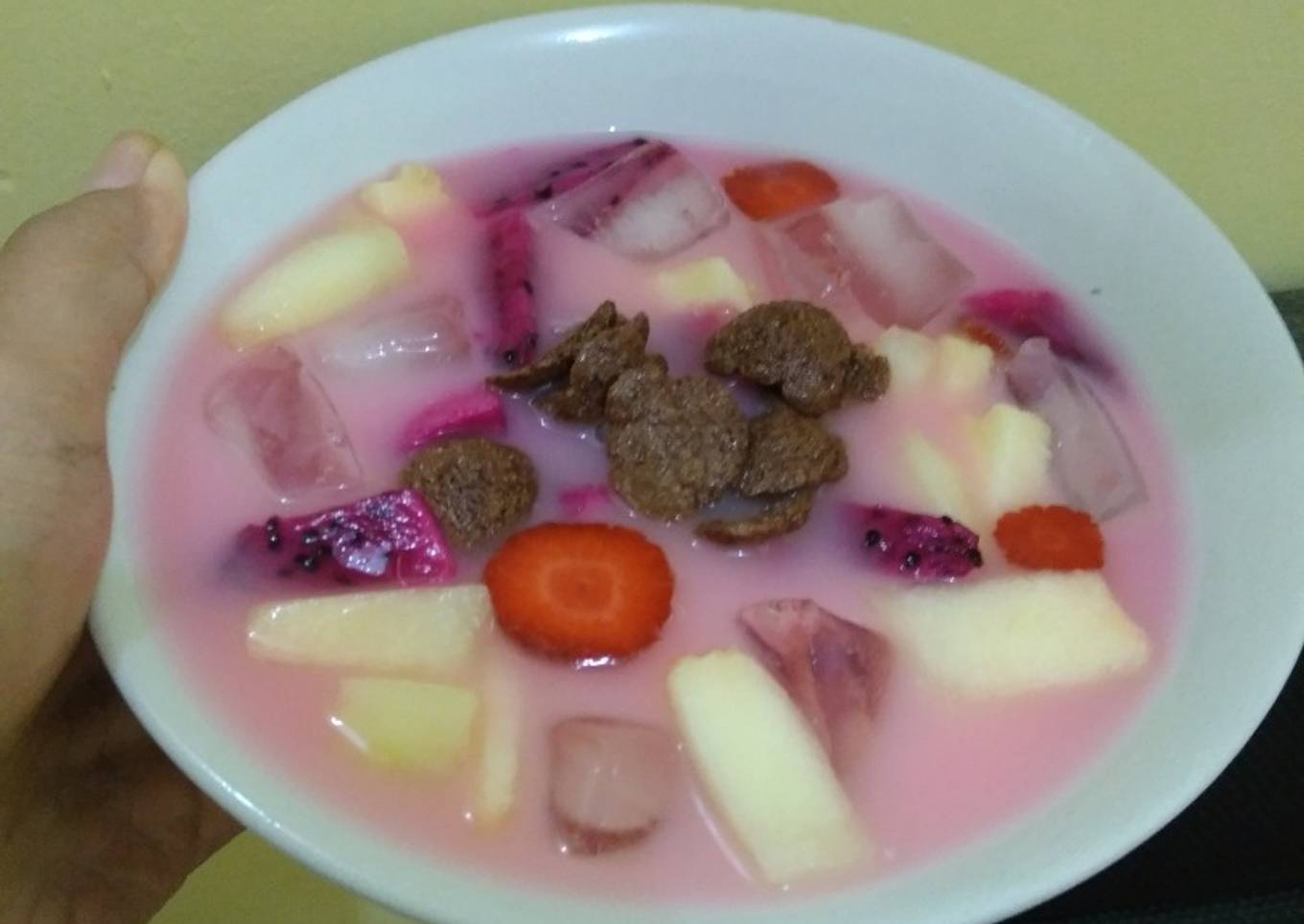 - Sebelum dihidangkan potong buah sesuai selera beri es batu dan tambah kuahnya. Alhamdulillaah suami memuji enak.