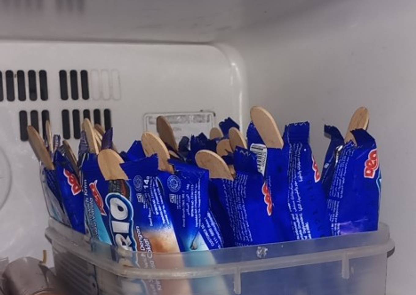 - Gunting bagian atasnya sedikit agar adonan dan stik es krim bisa masuk.Tuang adonan satu satu ke masing2 bungkus biskuit, tambahkan sendok es krim. Setelah itu masukkan ke dalam freezer dan tunggu sampai beku