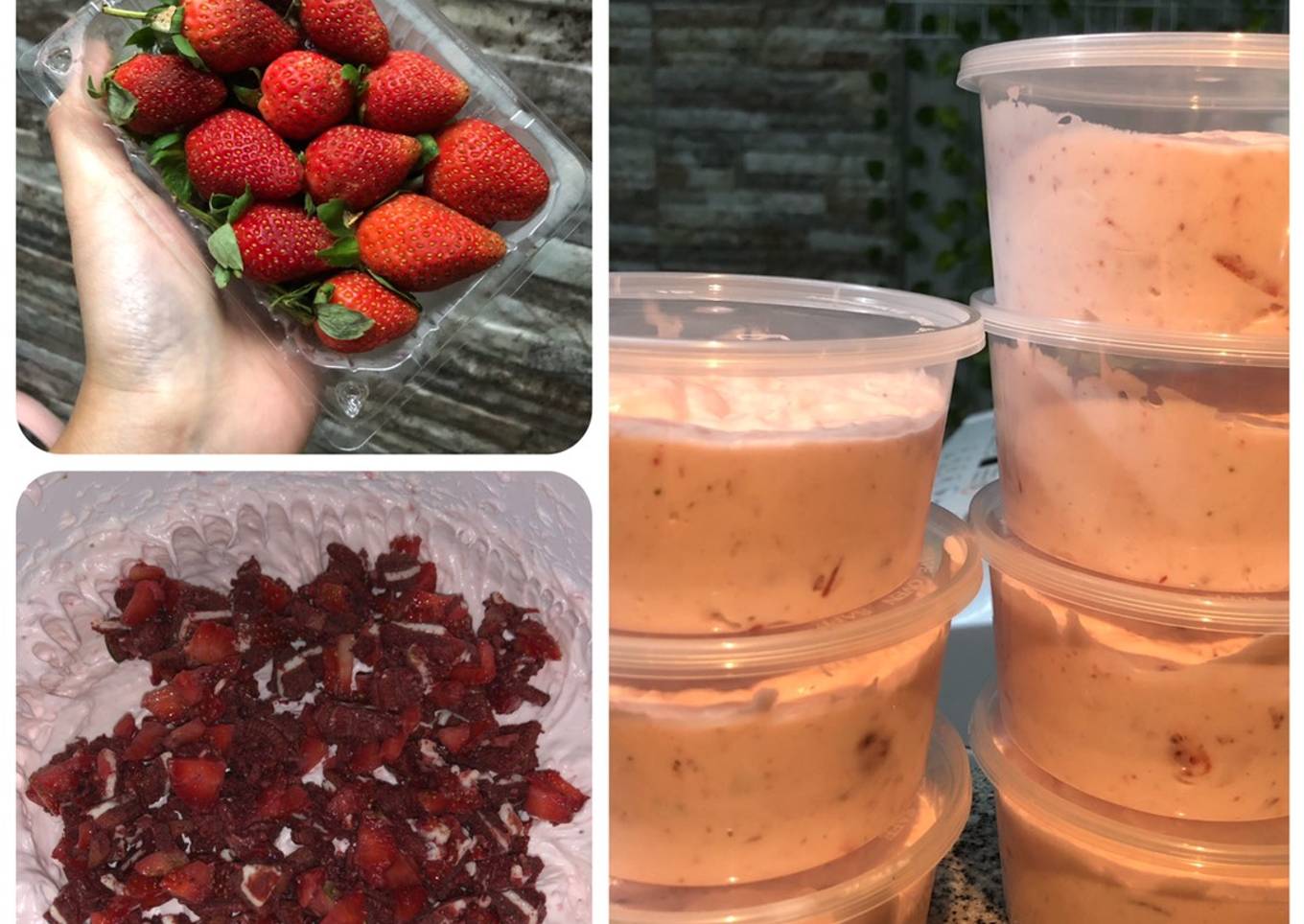 - Tambahkan potongan stroberi dan remahan oreo ke dlm adonan.. aduk rata dgn spatula saja.. tempatkan di wadah besar sekaligus atau cup. Simpan di freezer deh ☺️ 3 jam aja udah jd es krim kok 😋 manis segerrrr
