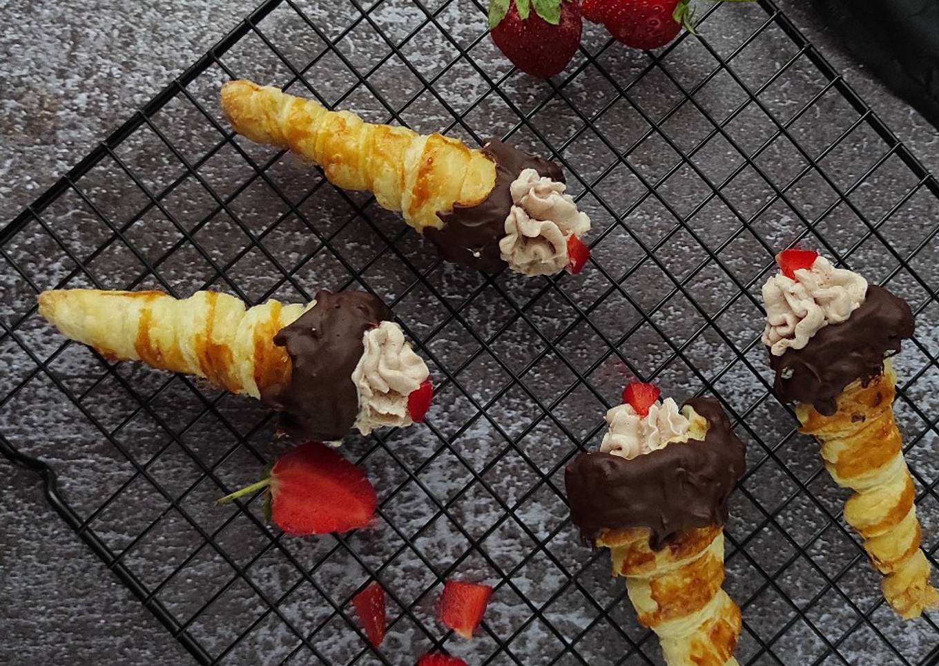 3. Celupkan Horn Pastry pada lelehan cokelat.