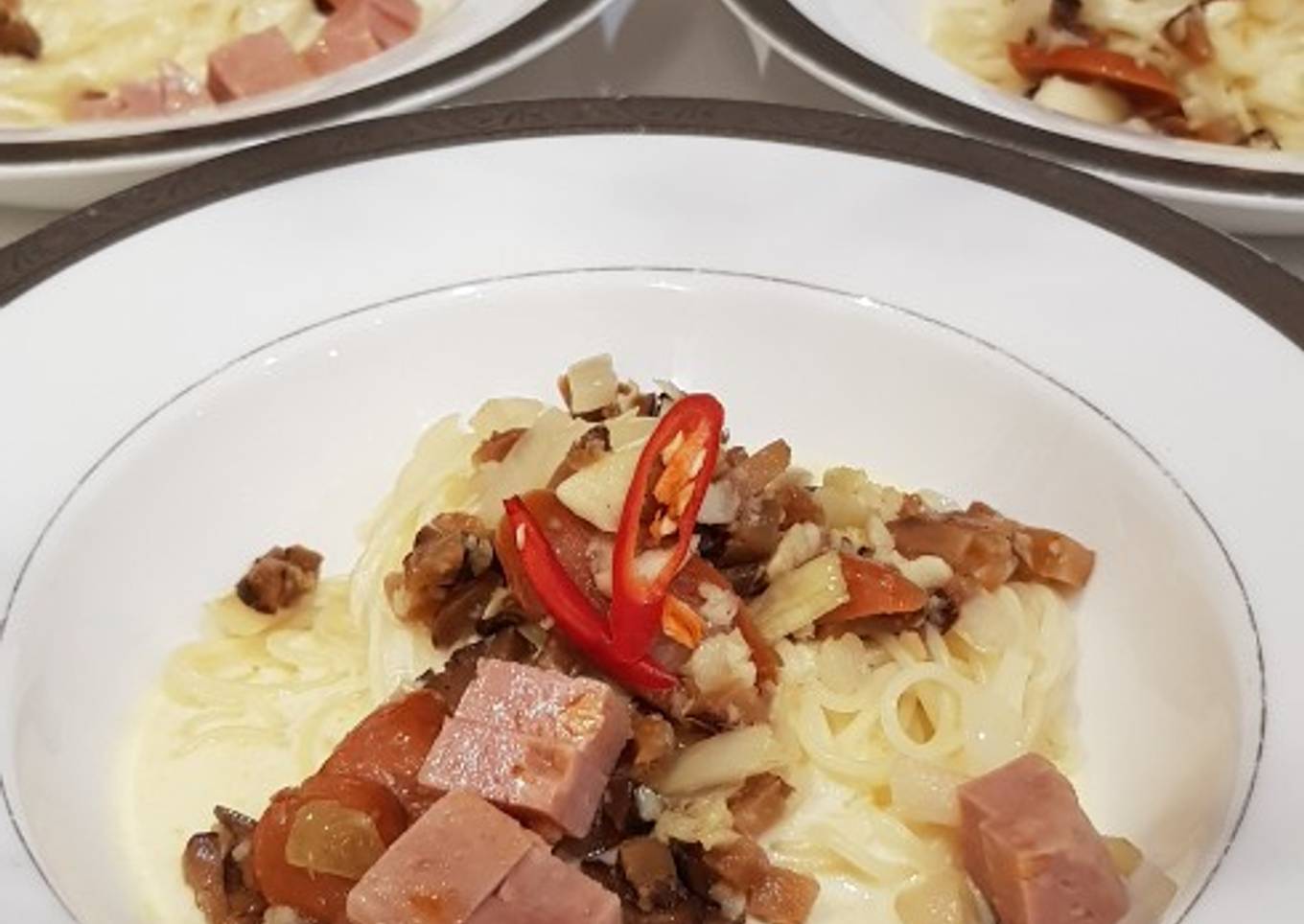- Sajikan dalam piring angelhair, cream cheese kemudian daging sosis yang sudah ditumis.