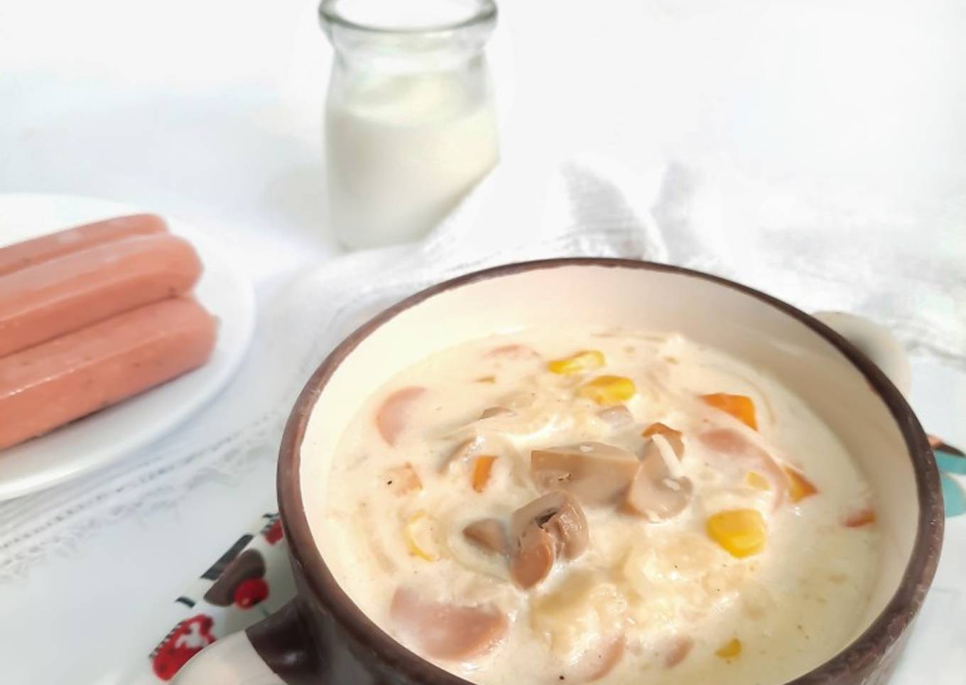 - Masukkan jamur,sosis,wortel dan jagung,aduk hingga tercampur rata. Tuang susu cair dan bumbui garam,lada bubuk dan kaldu bubuk. Aduk rata dan test rasa. Saya pakai teflon 24cm ternyata ngga muat, itupun susu belum ketuang semua)