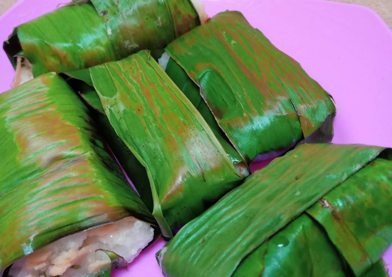 - Bagi nasi ketan menjadi 24 bagian. Bungkus dengan daun pisang dan dipanggang sebentar diatas teflon api kecil. Siap untuk disajikan